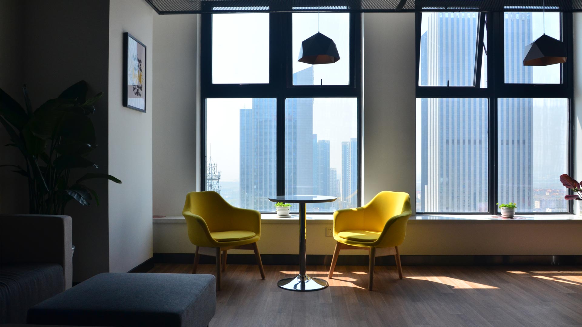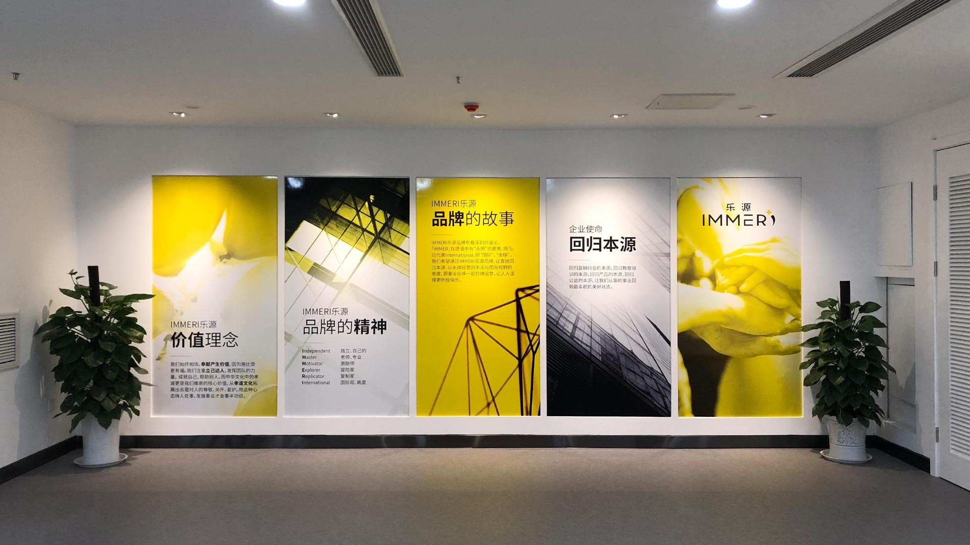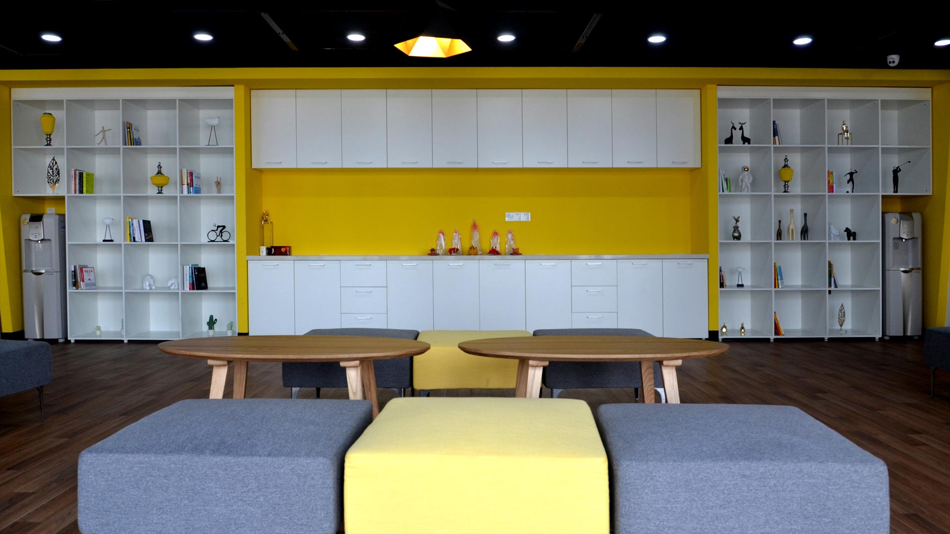 The yellow corporate color & repetitive ceiling pattern for the interior was both translated from IMMERI’s logo itself.