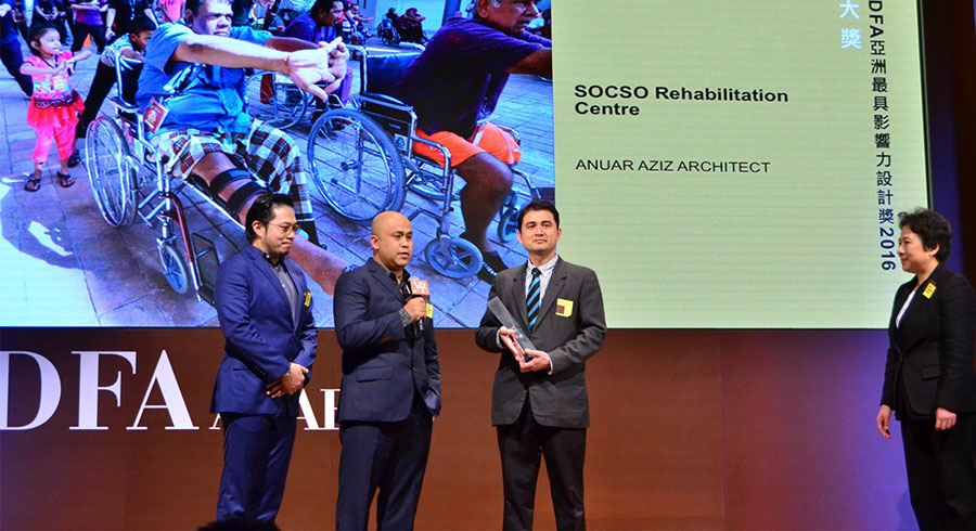 SOCSO Tun Razak Rehabilitation Center (TRRC) wins the Grand Award at DFA 2016 in Hong Kong. This project is awarded for its significant universal design and also 'Salutogenesis' and 'Biopsychosocial' concept that drive the project's uniqueness.
