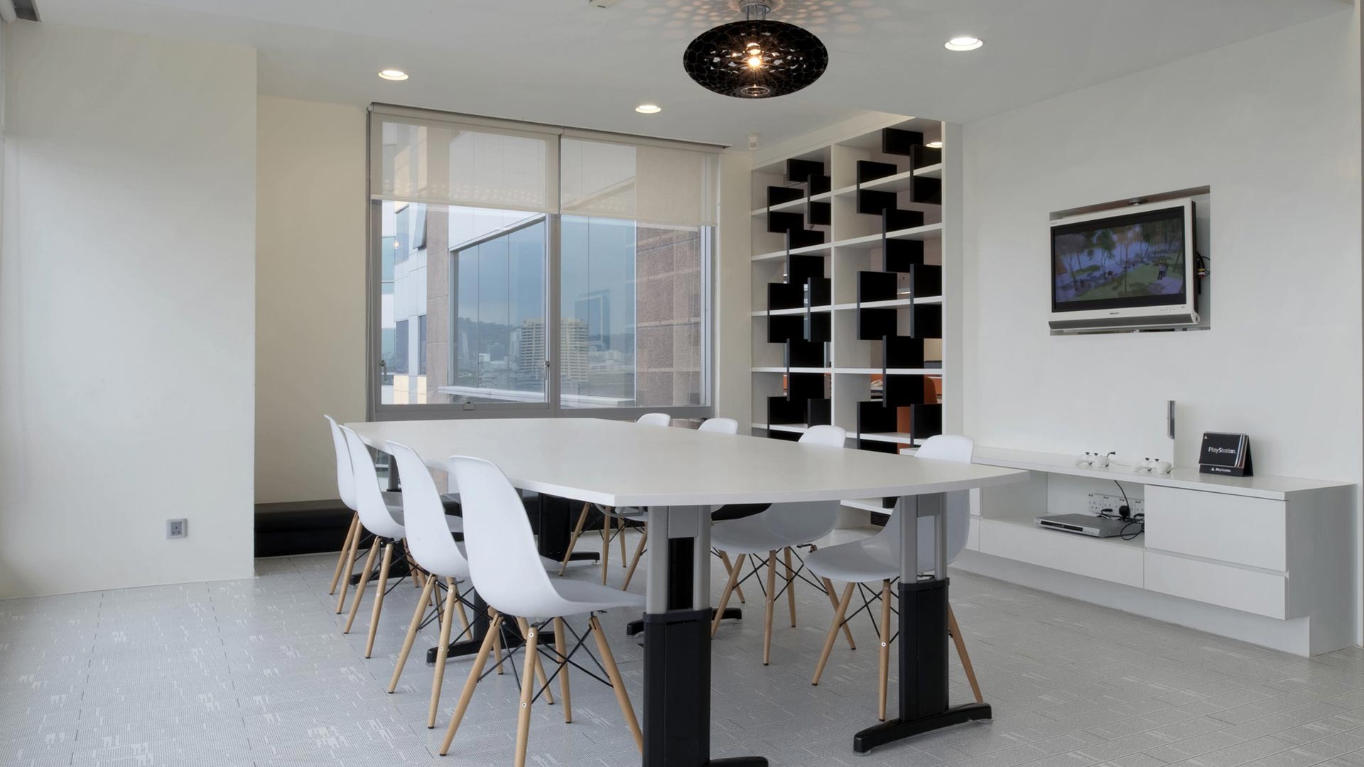 The breakout area is partitioned via a signature library wall & TV panel. The pantry is vibrantly coloured while PS3 games create group bonding. The space also serve as group working area, parties and religious classes. Colour palette is kept white, blue and black.